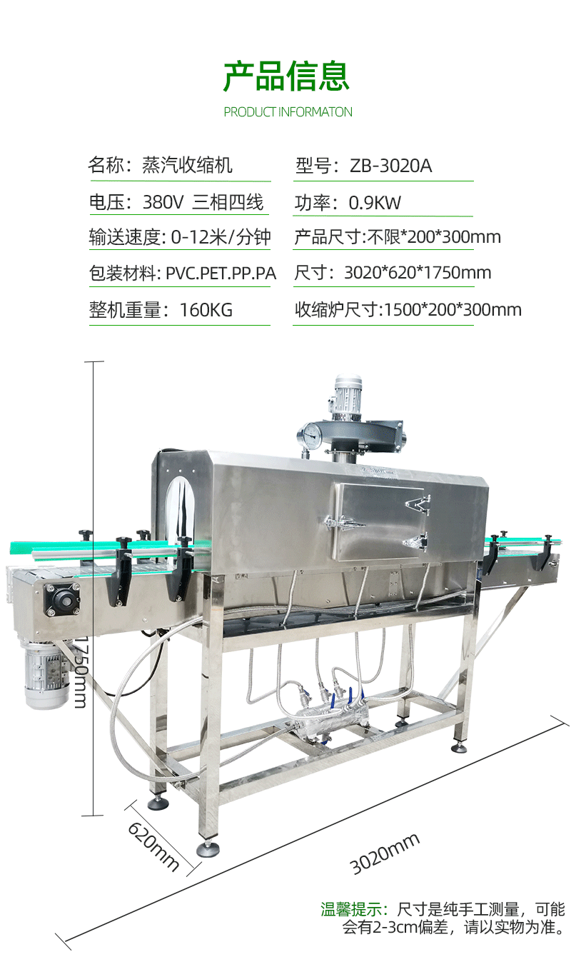 蒸汽收縮機是一種常用于產品包裝的設備,其工作原理是借助蒸汽的高溫熱能,讓包裹在產品外的收縮膜受熱收縮,從而達到緊固、美觀且保護產品的包裝效果。