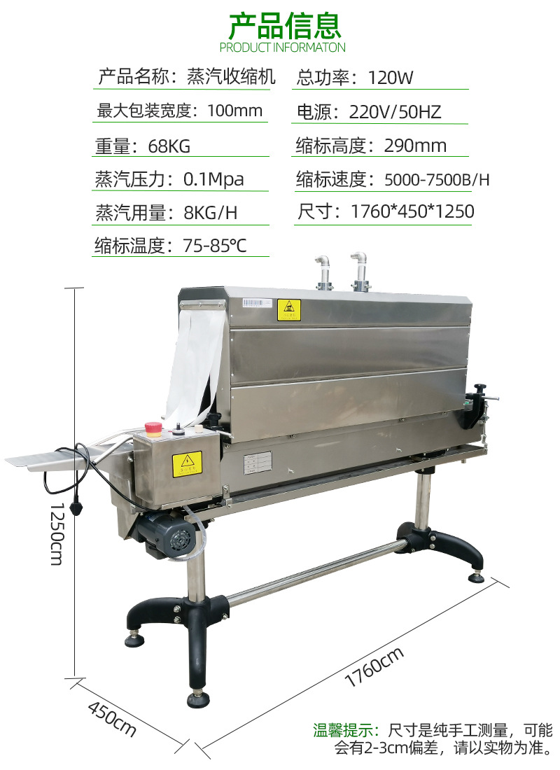 - 溫度可調節(jié):可以根據(jù)不同的包裝材料和產品要求,精確調節(jié)蒸汽溫度,確保收縮效果的同時避免過度收縮或收縮不足。