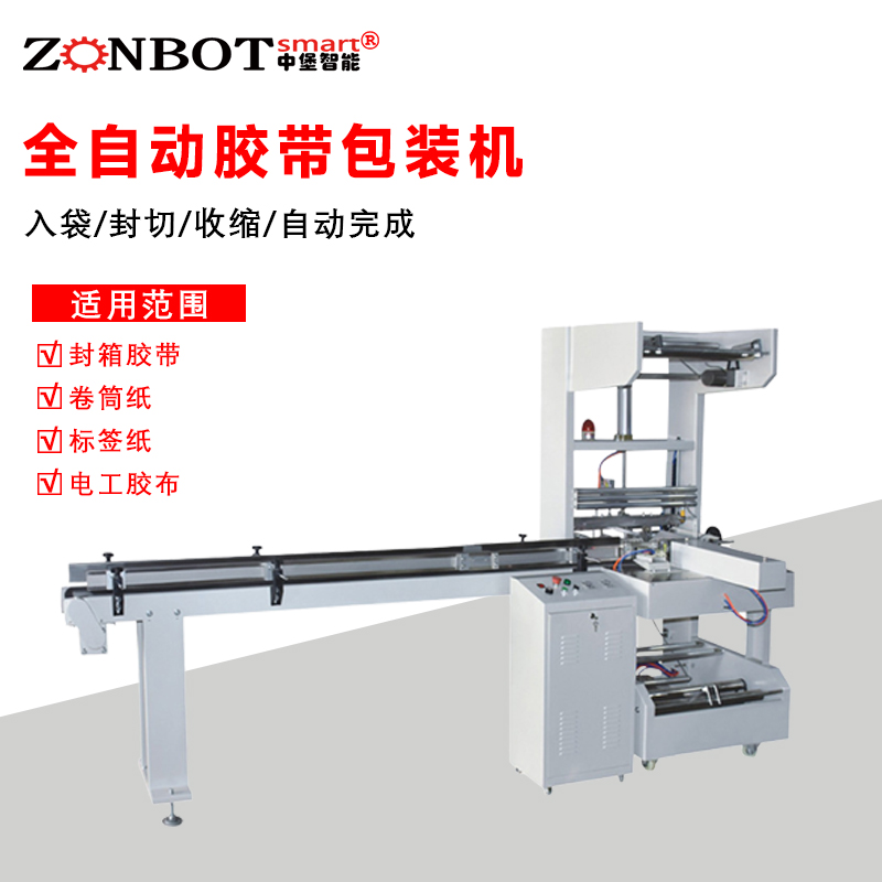 進料:首先通過進料裝置將膠帶卷有序地輸送到包裝區域。進料裝置一般有輸送帶,能夠穩定地把膠帶卷按照一定的間距逐個傳送,確保膠帶卷能準確進入下一個包裝環節。