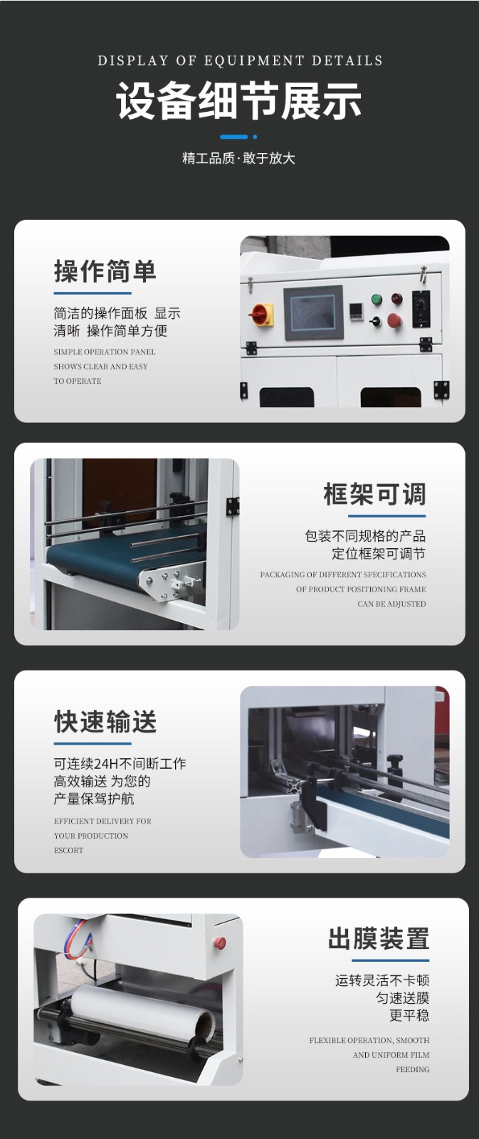 • 適應(yīng)性與靈活性:這種包裝機(jī)對(duì)產(chǎn)品的形狀、尺寸和包裝材料的適應(yīng)性較強(qiáng)。它可以通過(guò)簡(jiǎn)單地調(diào)整機(jī)器參數(shù)來(lái)包裝各種形狀(如正方體、長(zhǎng)方體、圓柱體甚至不規(guī)則形狀)和不同尺寸的產(chǎn)品。同時(shí),它能夠兼容多種包裝材料,包括不同厚度、材質(zhì)的塑料薄膜等。相比一些專用包裝機(jī),它的靈活性更高,能夠滿足企業(yè)多樣化的包裝需求。