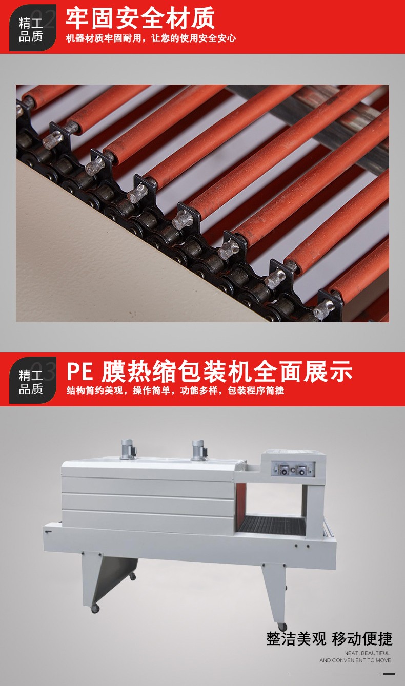 例如,當(dāng)把一個(gè)產(chǎn)品用 PE 薄膜包裹好,放入 PE 熱收縮機(jī)中,機(jī)器啟動(dòng)后,薄膜在熱的作用下,就像被賦予了 “生命力” 一樣,逐漸收縮,最后緊貼在產(chǎn)品的輪廓上,就像給產(chǎn)品穿上了一層定制的保護(hù) “外衣”。
