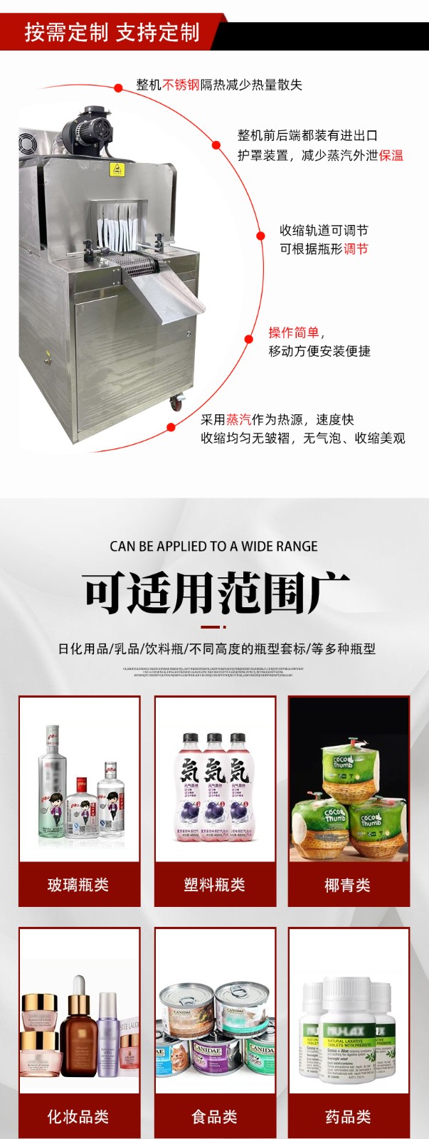 - 食品飲料行業:用于瓶裝飲料、易拉罐、醬料瓶的標簽收縮,蒸汽加熱能避免高溫破壞食品,同時標簽貼合度高,提升產品外觀檔次。