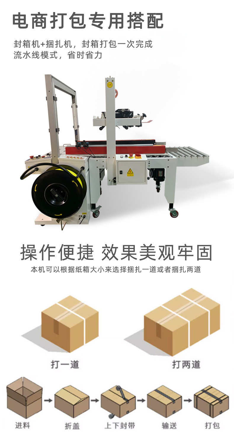 封箱打包一體機是一種機電一體化的自動裝箱設備,?它結合了自動折蓋封箱機和全自動捆包機,?形成了一個完整的包裝流水線系統。?這種機器特別適用于食品、?醫藥、?日化等行業,?能夠處理各種大小貨物的打包捆扎,?包括紙箱打包、?紙張打包、?藥箱打包等。?它的設計特點是臺面滾筒無動力,?針對顧客封箱及捆包雙機一體設計,?使得封箱、?捆包作業一體化,?提高了工作效率,?降低了人力成本。?